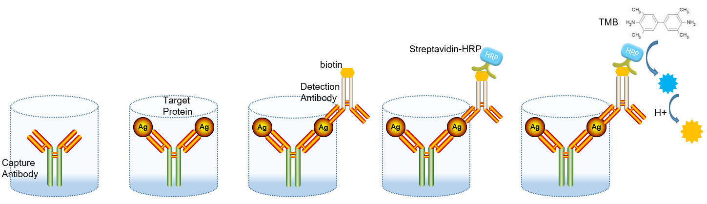 双抗体夹心法,其基本原理是将定量的包被抗体以物理吸附的方法固定于微孔板表面,然后加入待检标本,通过加入检测抗体,酶标记第二抗体后用TMB底物显色,微孔板中颜色的深浅与待测物的浓度呈正相关。