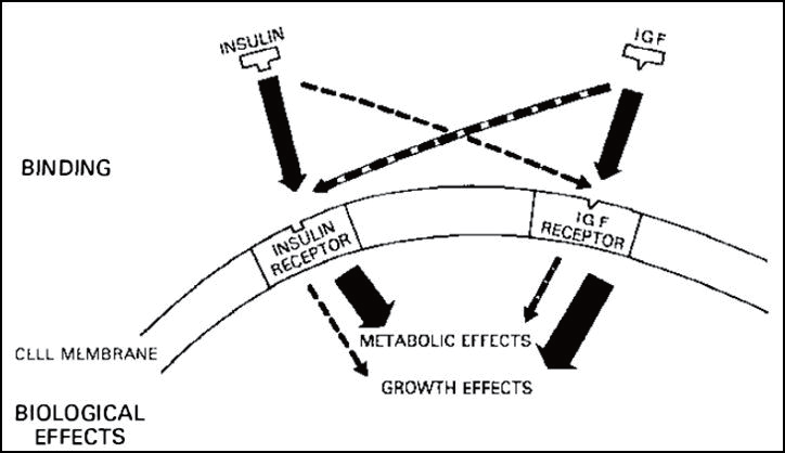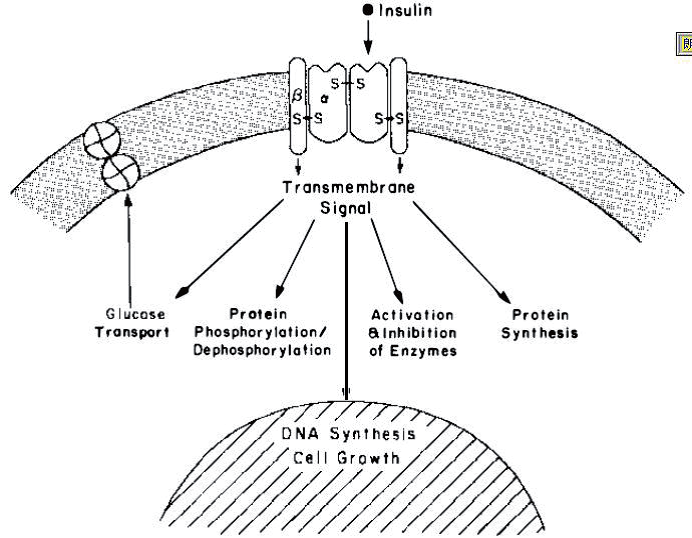 与其他肽类激素、细胞因子以及神经递质相似,胰岛素首先与细胞膜上的特异性受体结合,然后启动各种生物学效应[图2] 。比较特殊的是,胰岛素的受体并不仅仅存在于特异性的靶组织,即胰岛β细胞上,而是普遍存在于几乎所有哺乳动物细胞上,只是不同细胞上胰岛素受体的数量会有差异。因此,胰岛素可被用于几乎所有细胞的无血清培养基的配制中。