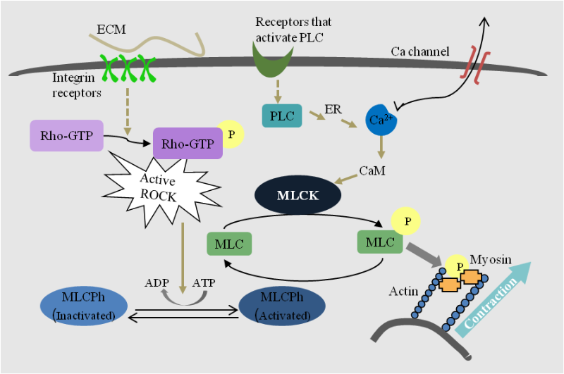 完整的信号Rho-ROCK信号通路包括:1)抑制蛋白(抑制信号):如髓磷脂相关蛋白(myelin associated glycoprotein, MAG)、神经生长抑制因子(neuronal growth inhibitor,包括Nogo-A、Nogo-B和Nogo-C)和少突胶质细胞髓鞘糖蛋白(oligodendrocyte myelin glycoprotein, OMgp)等。2)能够结合该抑制蛋白的受体:如Nogo受体(NgR)、配对免疫球蛋白样受体B(paired immunoglobulin-like receptor B, PirB)、p75神经营养因子受体(p75 neurotrophic receptor, p75NTR)等。3)Rho因子。4)ROCK及5)ROCK效应分子。各种细胞外抑制信号(如Nogo-A)通过与p75NTR结合形成NgR-p75NTR复合体在胞质内传导,继而激活Rho因子,使其从无活性的Rho-GDP转变成有活性的Rho-GTP,后者进而激活ROCK,通过影响肌动-球蛋白系统导致生长锥塌陷,抑制神经细胞增殖和细胞再生。因此,深入了解Rho-ROCK信号通路的功能,对研究神经损伤后再生与修复的方法与途径等具有重要意义。