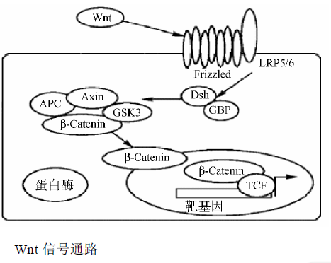 Wnt是一类分泌型糖蛋白,通过自分泌或旁分泌发挥作用。在小鼠中,肿瘤病毒整合在Wnt之后而导致乳腺癌。卷曲蛋白(Frz)作为Wnt受体,其胞外N端具有富含半胱氨酸的结构域, Frz作用于胞质内的蓬乱蛋白(Dsh),Dsh能切断β-catenin的降解途径,从而使β-catenin在细胞质中积累,并进入细胞核,与T细胞因子(TCF/LEF)相互作用,调节靶基因的表达。