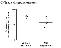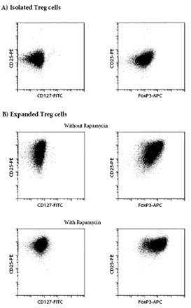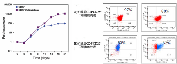 Fig.1 经Dynabeads®(11363D)分离得到的调节性T细胞,在Dynabeads® Treg Expander(11129D)刺激下扩增约100倍,在第8天二次刺激后,扩增更显著。在14天后,仍然高水平表达CD25和FoxP3(B)。