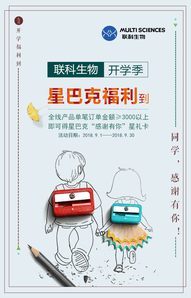 9月1日,开学啦!也许你还恋恋不舍暑假的轻松与惬意,也许你早就期盼着新学期和同学们相见,不论怎样,联科生物都不会缺席你们的开学典礼!来联科买开学装备,让科研之路更顺溜,点关注,不迷路!同学、感谢有你,9月购买联科生物销售产品即可得100元星巴克星礼卡! 快和身边的小伙伴们约起来吧……