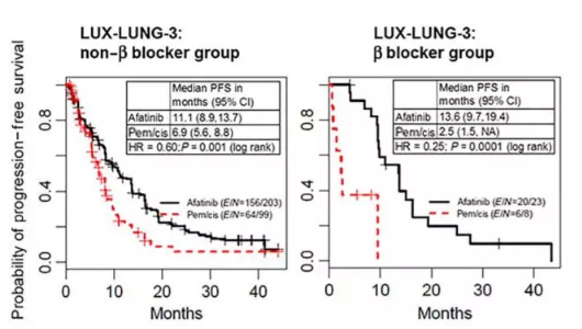 细胞和小鼠实验完成后,研究人员下一步就是检验人体内是否也存在同样的机制。利用现成的3期肺癌临床试验数据,研究人员们做了回顾性的分析。他们发现,那些IL-6水平较高的患者,接受EGFR抑制剂的治疗后,中位总体生存期不容乐观,只有区区4.8个月。而那些IL-6水平较低的患者,中位总体生存期能达到11.5个月!此外,研究人员也证实,β肾上腺素抑制剂的确能起到降低IL-6水平的作用。换句话说,那些缓解压力的药物,也许真的可以延长肺癌患者的生命。 这一点在另一个分析中得到了验证。在一项名为LUX-Lung3的研究中,研究人员注意到,一些使用了EGFR抑制剂的患者,碰巧也使用了β肾上腺素抑制剂。这些患者的中位无进展生存期(疾病不发生进展)为13.6个月,高于没有使用β肾上腺素抑制剂的患者(11.1个月)。