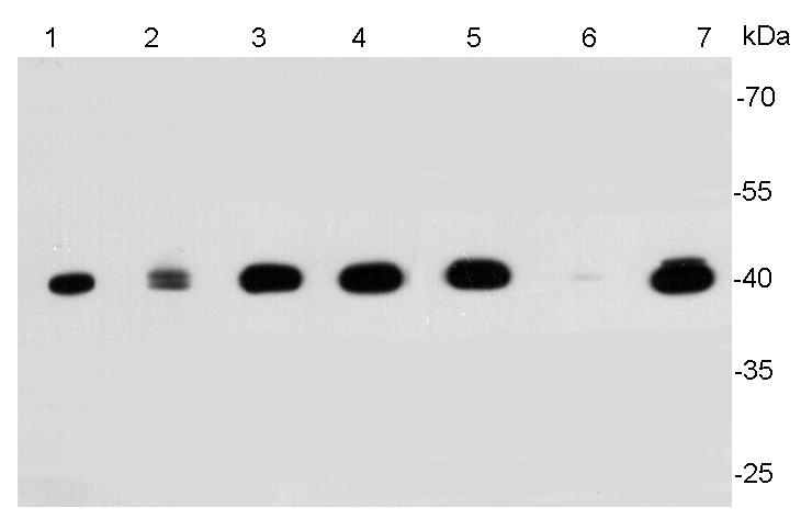 Lane 4: NIH/3T3 Lane 5: Hela Lane 6: HT-29