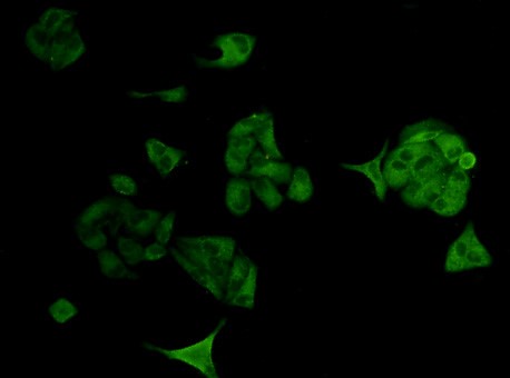 ICC staining of ERK2 in A549 cells (green). Cells were fixed