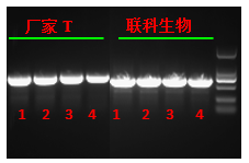 | 不同浓度模板用本试剂进行PCR扩增,模板浓度高至20ng,低至0.16ng,都能扩增出较好的条带。模板浓度:1、20ng 2、4ng 3、0.8ng 4、0.16ng | ![]() |