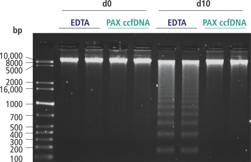 PAXgene Blood ccfDNA 稳定技术有助于防止血细胞凋亡和基因组DNA 片段化。 采用QIAamp Blood Mini Kit 从2位受试者的全血中提取基因组 DNA。利用琼脂凝胶电泳技术分析 400ng 的 DNA。