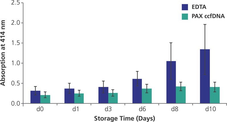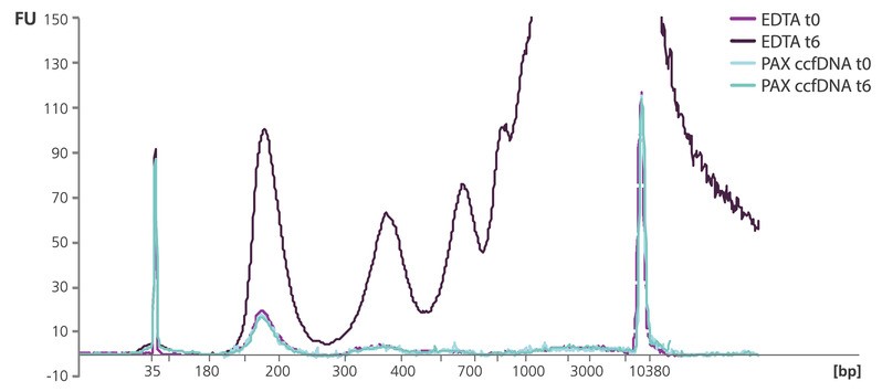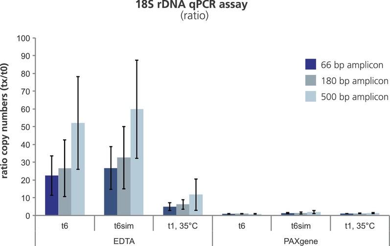 PAXgene Blood ccfDNA 稳定技术有助于防止白细胞释放基因组 DNA。从 6 位受试者的全血中分离血浆;提取 ccfDNA,并通过实时 PCR 定量(18S rDNA 基因,66 bp/180bp/500bp扩增子)。