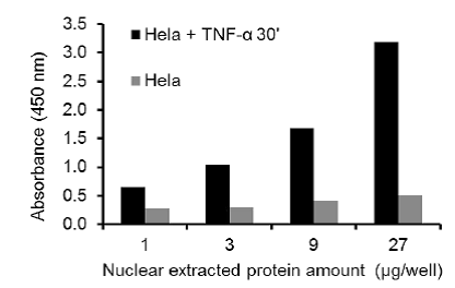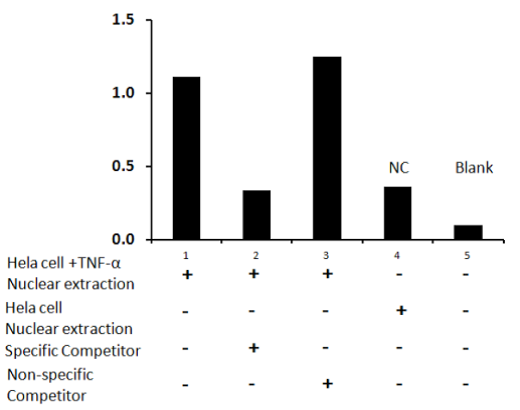 | 图:(左)HeLa细胞或TNF-α处理的HeLa 细胞中NF-κB p50转录因子的活性测定。TNF-α刺激后,活化的NF-κB p50易位到细胞核,与相应的DNA结合。(右)HeLa细胞或TNF-α处理的特异性竞争者或非特异性竞争者处理的HeLa 细胞中NF-κB p50转录因子的活性测定。结果显示NF-κB p50特异结合在NF-κB DNA结合位点。 |