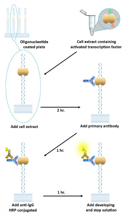 双链寡核苷酸包被于96孔板,经过短暂的孵育,这些寡核苷酸专门捕获包含于总细胞裂解液或核提取物中的目标转录因子。随后,一抗识别每孔中的目标转录因子-DNA复合物,然后HRP-conjugated二抗是用于检测。