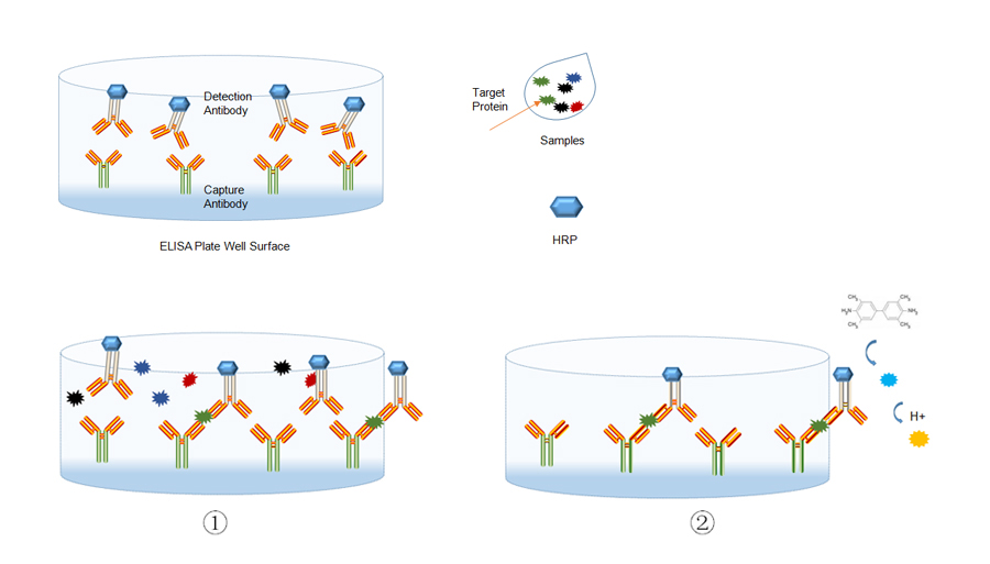 - 传统的二步法 ELISA 是将捕获抗体预包被于微孔板的微孔表面,与样品中的靶蛋白特异性结合。清洗后,加入检测抗体,连接到靶蛋白的第二位点,形成夹心复合物。