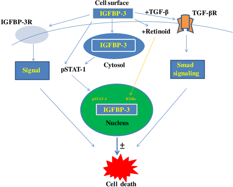 IGFBP-3也可能通过与IGFBP-3R(受体)结合来激活下游的各种信号分子诱导细胞凋亡,或者与TGF-β受体结合导致Smad激活从而导致细胞凋亡。IGFBP3还可激活Stat-1或与RXR-α结合,诱导其抗增殖和促凋亡作用(图1)。