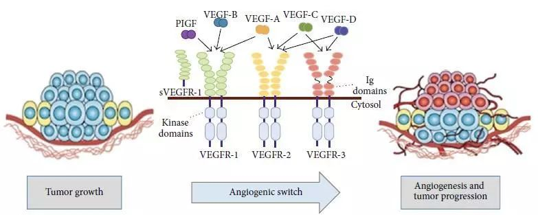 酪氨酸激酶受体(VEGF Receptors, VEGFRs)分为VEGFR-1、VEGFR-2和VEGFR-3。它们以二聚体的形式发挥功能。当VEGF与酪氨酸激酶受体结合后,胞内激酶区构象改变,产生激酶活性催化底物蛋白磷酸化,最终通过信号传导分子的级联反应产生一系列生物效应。VEGF与VEGFR-1结合的强度是与VEGFR-2结合的强度的10倍,但R1活性较弱,且被认为具有负向调控VEGFR-2的功能,因此VEGFR-2是主要产生生理效应的受体。VEGFR-1和VEGFR-2主要分布在肿瘤血管内皮表面,调节肿瘤血管的生成;VEGFR-3主要分布在淋巴内皮表面,调节肿瘤淋巴管的生成。