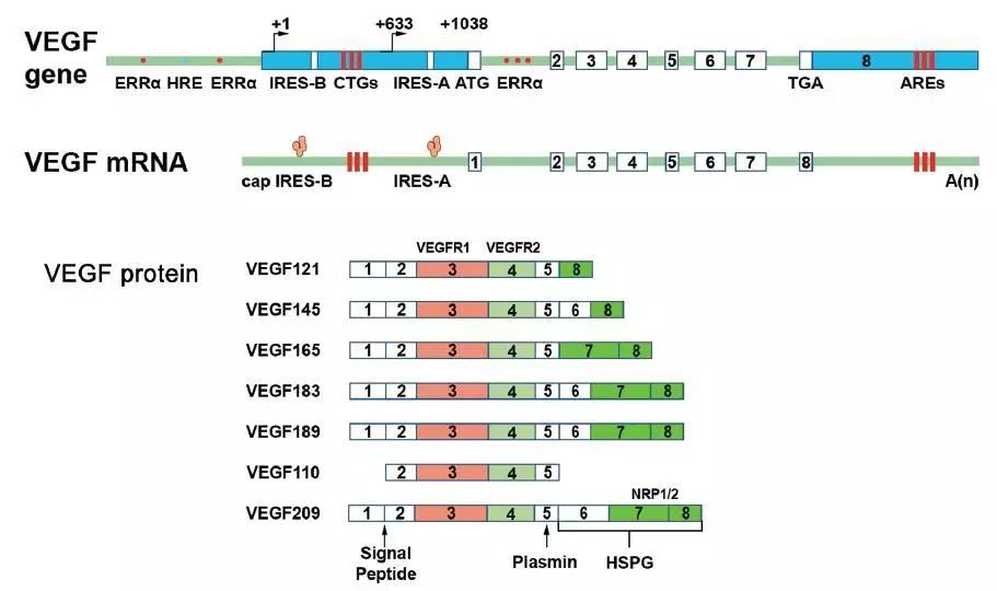 | VEG-A基因、VEGF-A前体mRNA及其蛋白形成的结构和受体结合位点的示意图[2] |