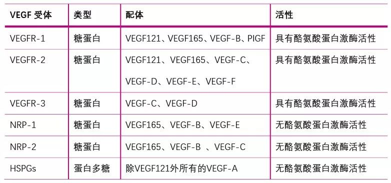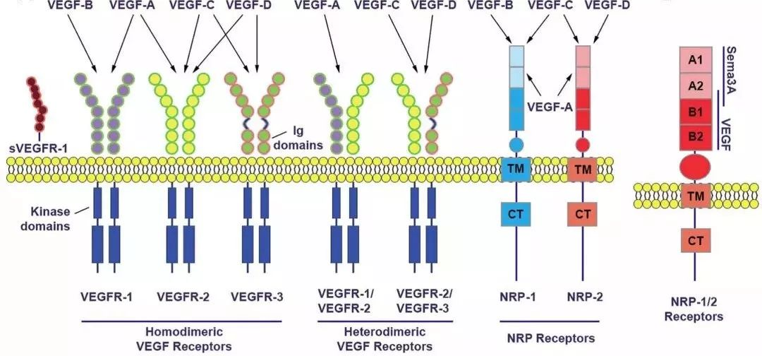 VEGF家族蛋白表达后主要与受体相互结合发挥功能。VEGF受体分为三大类: