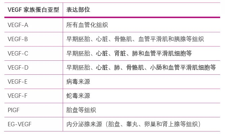 VEGF-A在血管早期的形成中发挥重要作用,所有血管化组织均可表达VEGF-A。除此之外,许多其它细胞在缺氧应激条件下也可表达VEGF-A,如巨噬细胞、血小板、树突状细胞(Dendritic Cells, DC)、活化的T细胞、视网膜色素上皮细胞、视网膜中的Muller细胞、星形胶质细胞、成骨细胞、支气管与肺泡上皮细胞、周细胞、血管平滑肌细胞、肌成纤维细胞、角质形成细胞、肾系膜细胞和肿瘤细胞等。