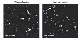 exoRNeasy纯化exosomes和其他细胞外微泡与超速离心法相比,不仅速度更快,并且产物纯度更高。扫描电镜显示,虽然这两种纯化技术都能够纯化预期大小的完整的囊泡,但超速离心法的产物还含有很多不符合预期的更小、或其他形状的细胞结构。